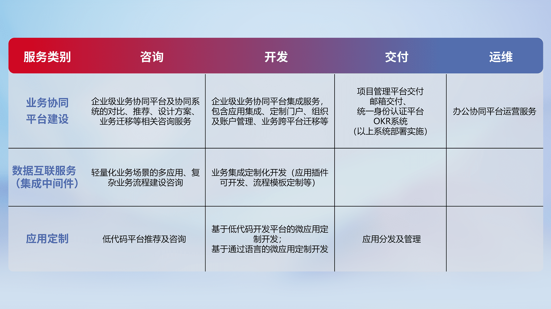 针对钉钉、、、、企微、、、IDaas等平台级产品提供产品的规划、、、方案、、、、交付、、、定制化开发等服务,,,实现如统一协同办公、、智能客户服务、、、、混合会议管理、、智能数据查询、、、、等业务场景,,,实现数字化转型。。