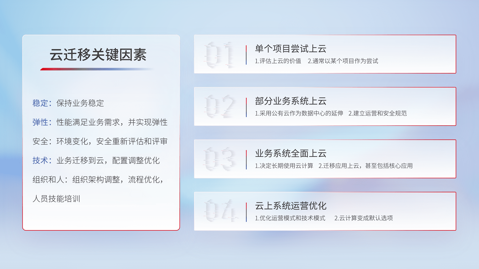 结合实际业务,,,从规划设计、、、、云平台选型、、、、云原生改造、、、、数据迁移、、、集成交付,,,迁移全过程为客户识别最佳上云路径,,,,做好风险识别管理,,设计网络架构、、身份权限、、、安全审计合规、、、、操作审计、、、日志审计、、监控告警策略、、多站点容灾设计等,,对云上基础设施进行整体规划,,提升IT治理水平,,,,以满足弹性、、、高可用、、高性能的需求。。。。